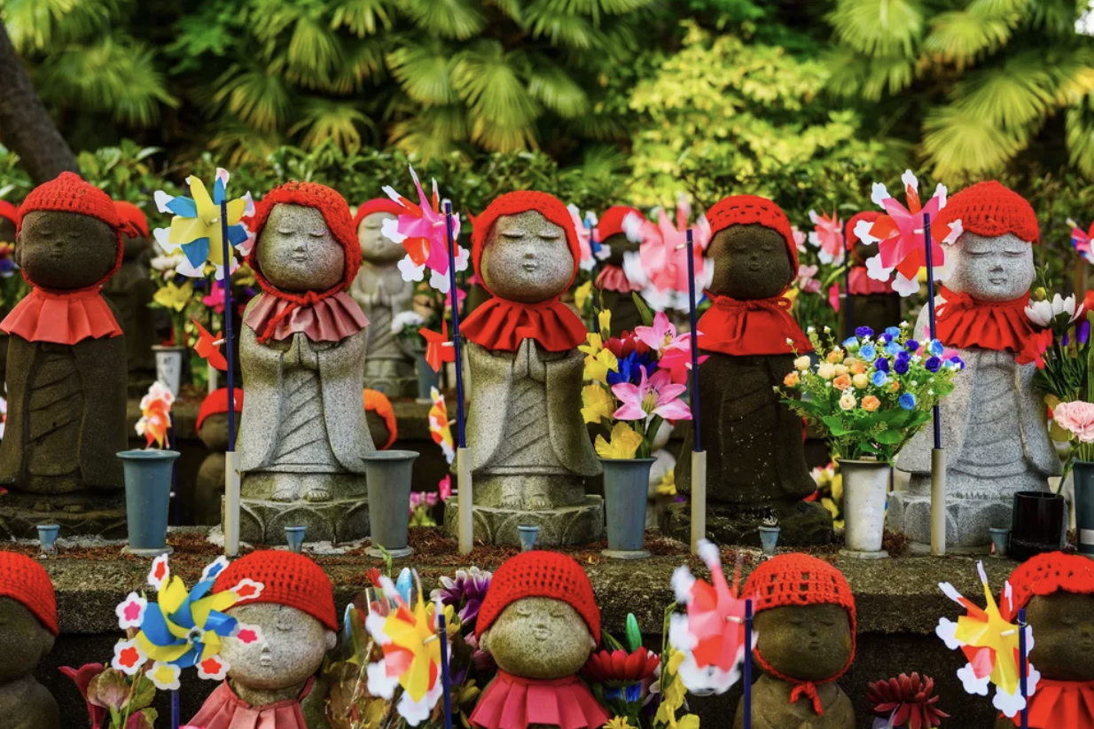 Standing beside the Tokyo Tower, one of Tokyo’s great odes to modernity, is the Zojo-ji Temple, a Jōdo-shū Buddhist temple in the city’s Minato ward. To the right of its nearly 700-year-old main hall are rows upon rows of small statues lining the temple grounds. They are thoughtfully adorned and carefully dressed, often in red, a color known to ward off evil. These figures are Jizō, bodhisattvas who have chosen to remain on earth as guides and protectors of children, particularly the Mizuko: the “water children” who were never born. Miscarried, aborted, stillborn, or otherwise lost before arriving to the world in living form, Mizuko exist in a perpetual liminal space. The statues of Zojo-ji Temple serve as embodied offerings to these waylaid souls.